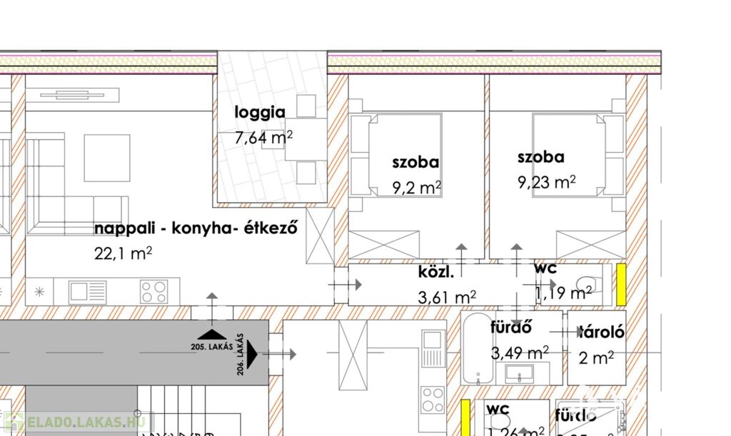 A 1 db amerikai konyhás nappalival, 2db hálószobával, 1 db fürdőszobával, közlekedővel, loggiával rendelkezik.
