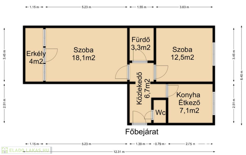 Helységek: 2 külön bejáratú szoba melyek közül a nagy szobához erkélykapcsolat is tartozik, közlekedő, fürdő, konyha, külön mellékhelység.