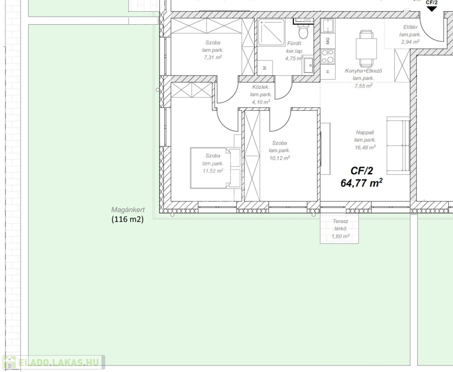 Mendén csodálatos zöld környezetben a Hétdomb lakóparkban, I. ütem második szakaszában megvalósuló új építésű zárt lakóparkban, A. kategóriás energiatakarékos ( hőszivattyús ) 16 lakásos társasházban, nettó hasznos 64,77 m² alapterületű, FÖLDSZINTI kertkapcsolatos lakást, SAJÁT 116 m² KERTRÉSSZEL kínálunk eladásra (C épület Földszint 2. Lakás).