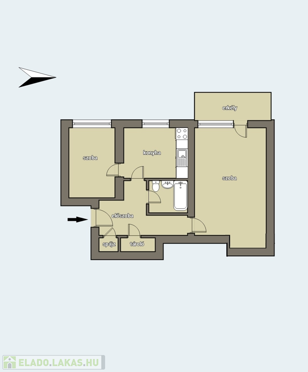 - 2 szoba, konyha-étkező, kamra, fürdőszoba WC-vel, tároló előszoba, közlekedő, pince