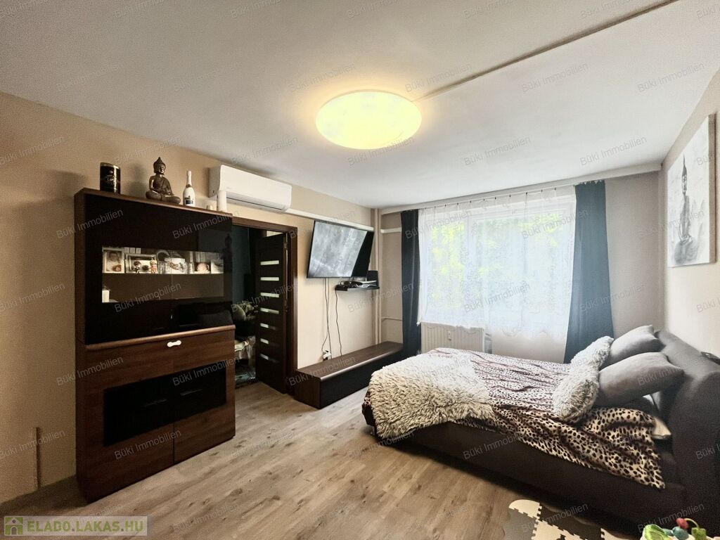 Belépve az előszobából egy tágas, világos nappali fogad, amelyből egy hangulatos hálószoba nyílik, jelenleg gyerekszobaként használva, de dolgozóként, gardróbként vagy vendégszobaként is remekül funkcionálhat. Innen léphetünk ki az erkélyre, ahol reggeli kávé mellett a Diósgyőri Vár lenyűgöző látványa tárul elénk. A nappali másik oldalán egy második fél szoba kapott helyet, így minden családtagnak jut saját kuckó. Tovább haladva a folyosón a modern konyhába és az étkezőbe érkezünk, ahol egyedi bútorzat, beépített gépek és kényelmes hely áll rendelkezésre a közös étkezésekhez. A felújított fürdőszoba praktikus kialakításának köszönhetően minden kézre áll, a külön helyiségben található WC pedig a mindennapok kényelmét szolgálja.