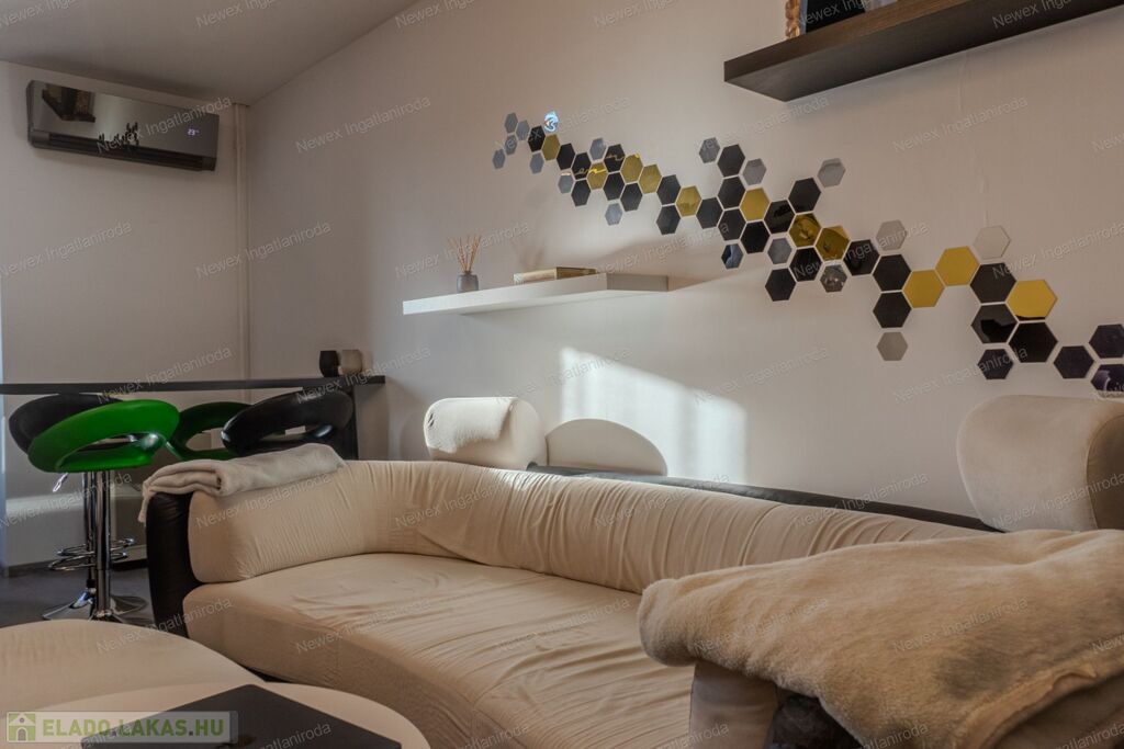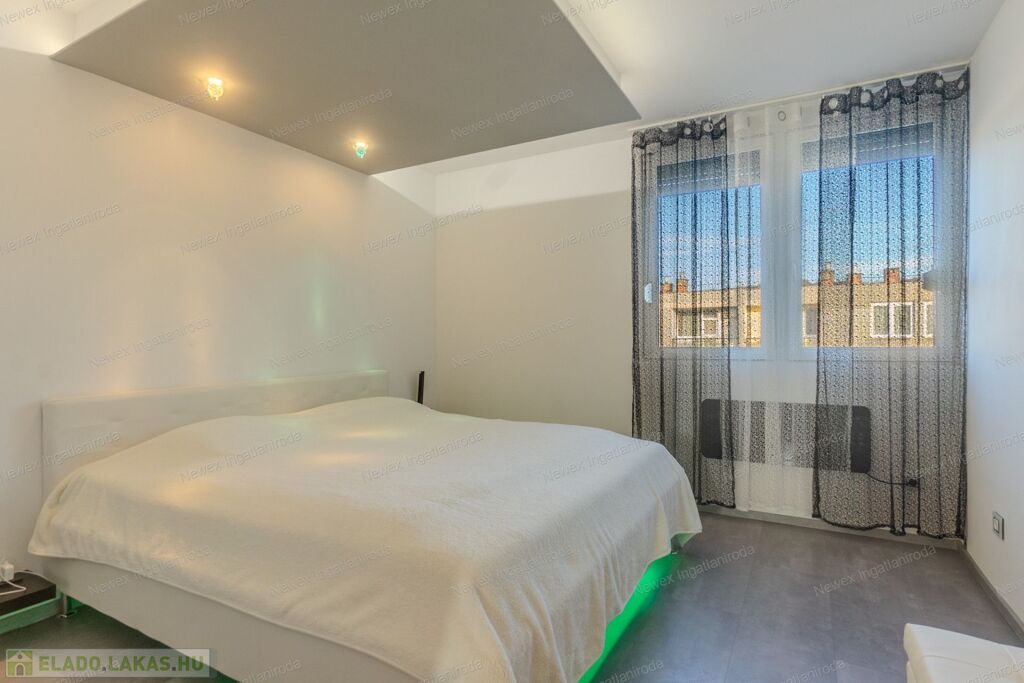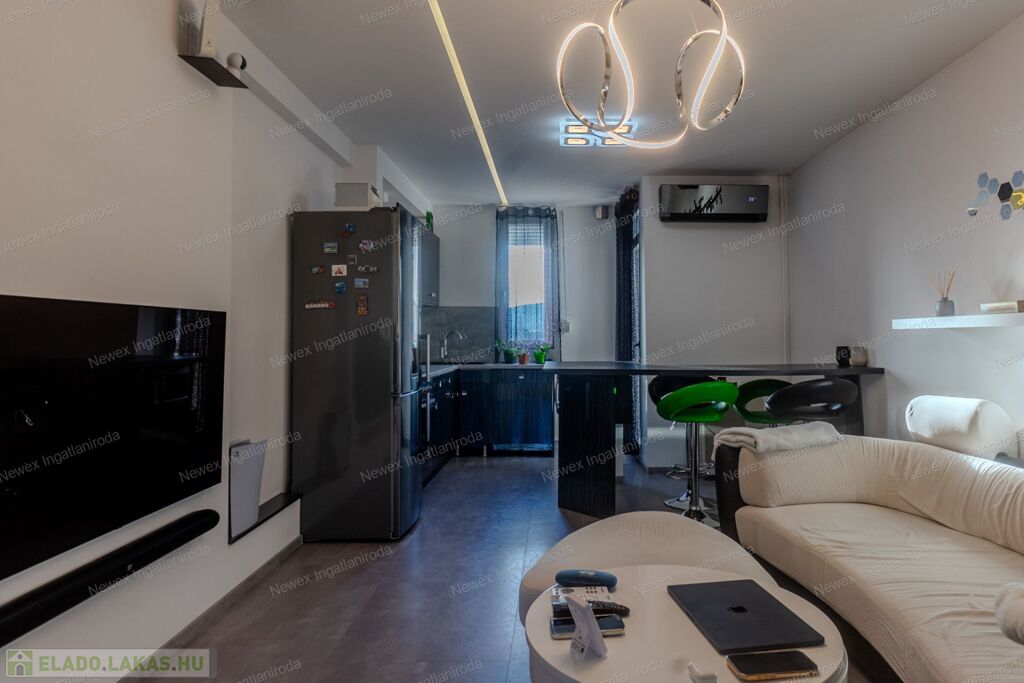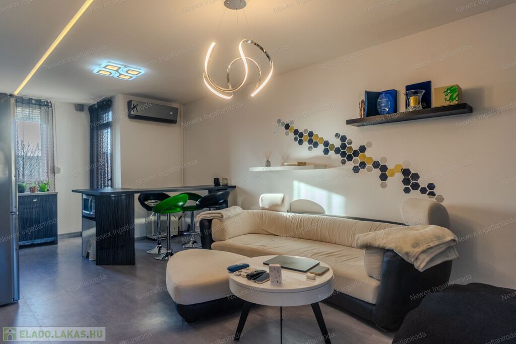 A lakásban 10 cm vastag szigetelt gipszkarton álmennyezet, felújított víz- és villanyhálózat, légkondicionáló és újonnan kialakított konyha található. A műanyag nyílászárók szigeteltek, redőnnyel és szúnyoghálóval ellátott.
