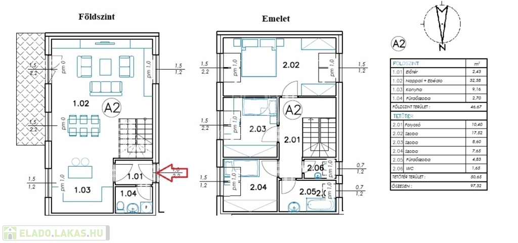 - a földszinten nappali, konyha-étkező, fürdőszoba-wc