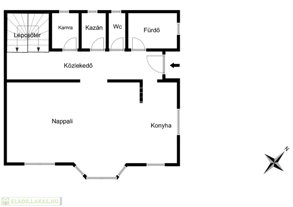A földszinten egy tágas, amerikai konyhás nappali kapott helyet, amely a családi élet központja lehet. Innen nyílik egy praktikus kamra, valamint egy fürdőszoba, külön WC és háztartási helyiség, amelyek a mindennapi kényelmet szolgálják.