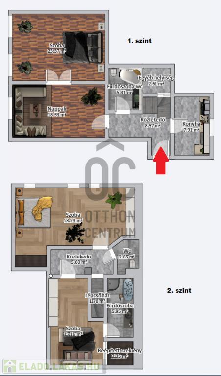 - Belső 2 szintes, 2. emelet + tetőtér.