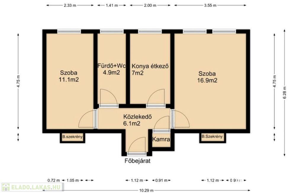 Belső lakrész helységei: 2 külön bejáratú szoba, közlekedő, kamra, fürdő mellékhelységgel együtt, étkezős konyha.