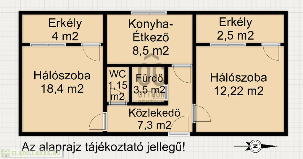 - 2 tágas hálószoba, konyha- étkező, fürdő, külön WC, közlekedő, 2 erkély helyiségekből áll