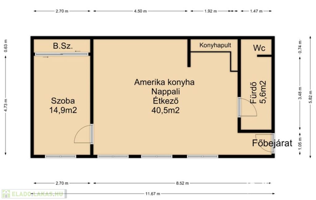 Belső lakrész helységei: 1 szoba, amerikai konyha nappali étkező egy légtérben, fürdő mellékhelységgel együtt.