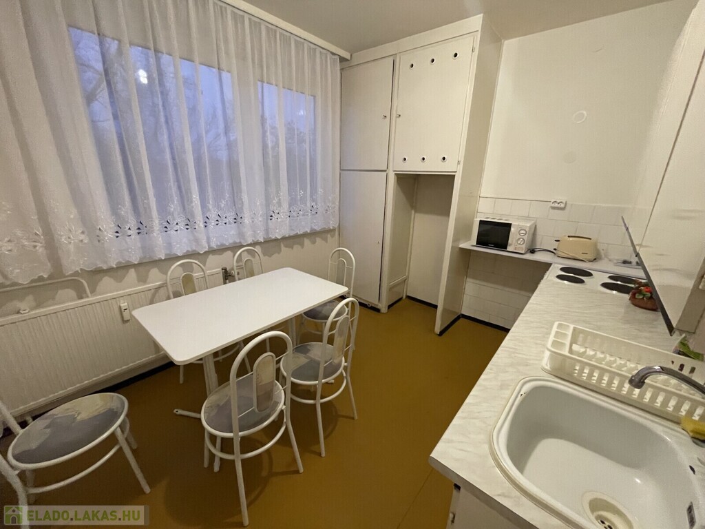 Panel építésű társasház 3. emeletén található, mért távfűtéses, műanyag nyílászárós, laminált padló, járólap burkolatú.
