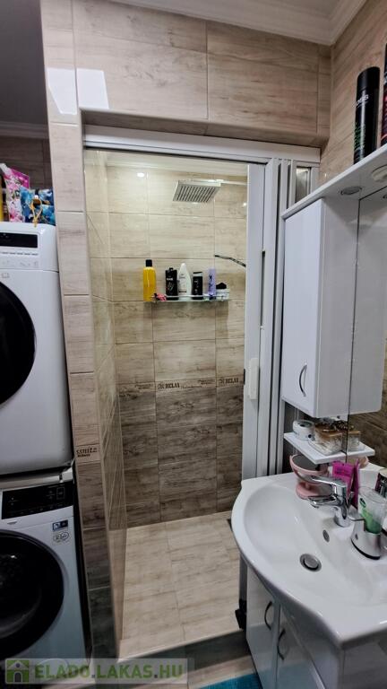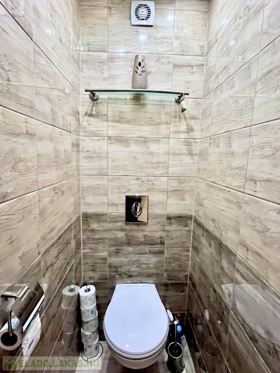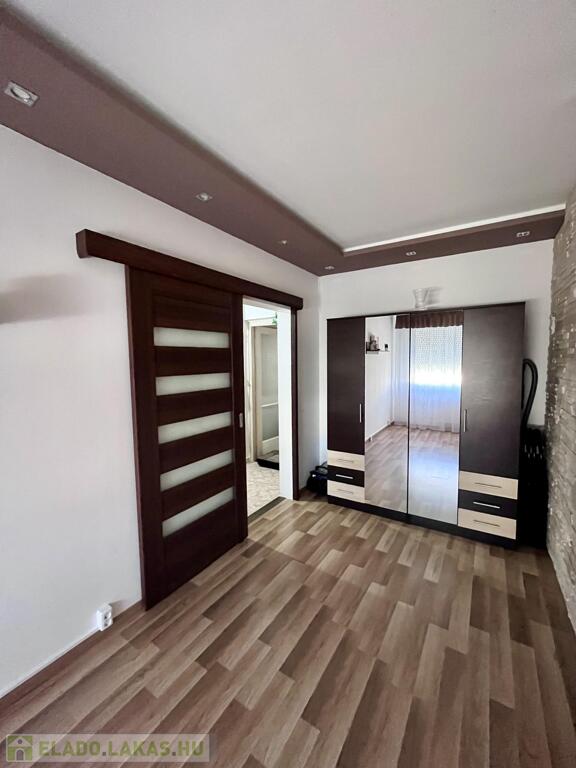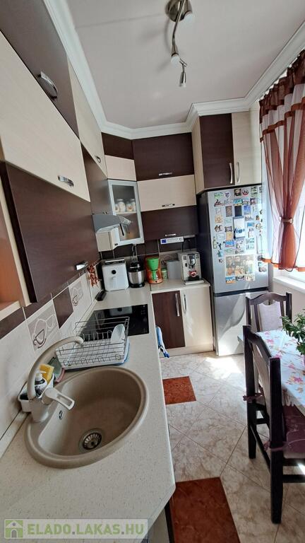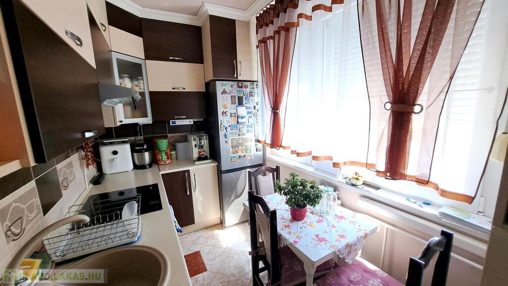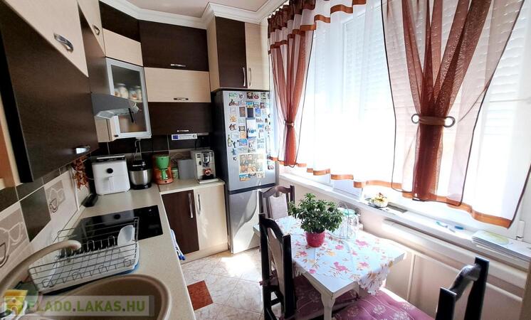 A lakás műanyag nyílászárókkal, redőnyökkel, biztonsági bejárati ajtóval felszerelt, felújított fürdőszobával és külön WC-vel várja új tulajdonosát. A konyhában beépített, gépesített konyhabútor található, amely – csakúgy, mint a többi helyiségben lévő beépített szekrények – a vételár részét képezi.