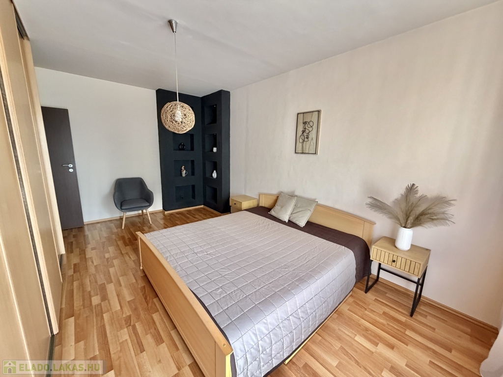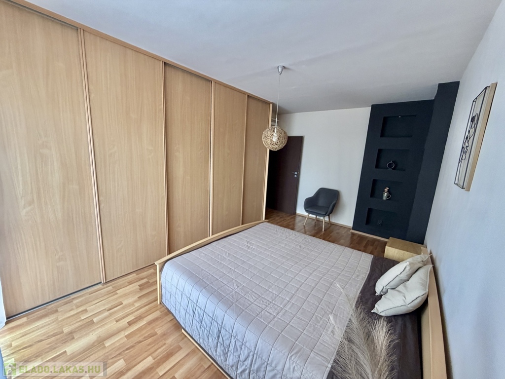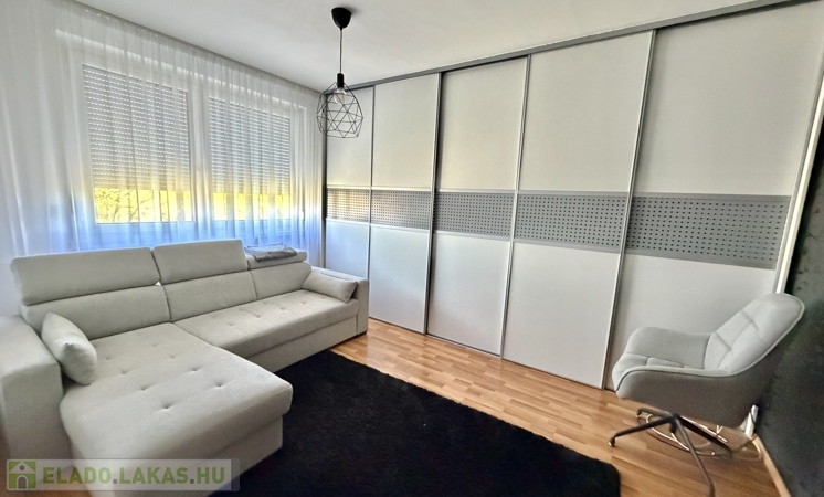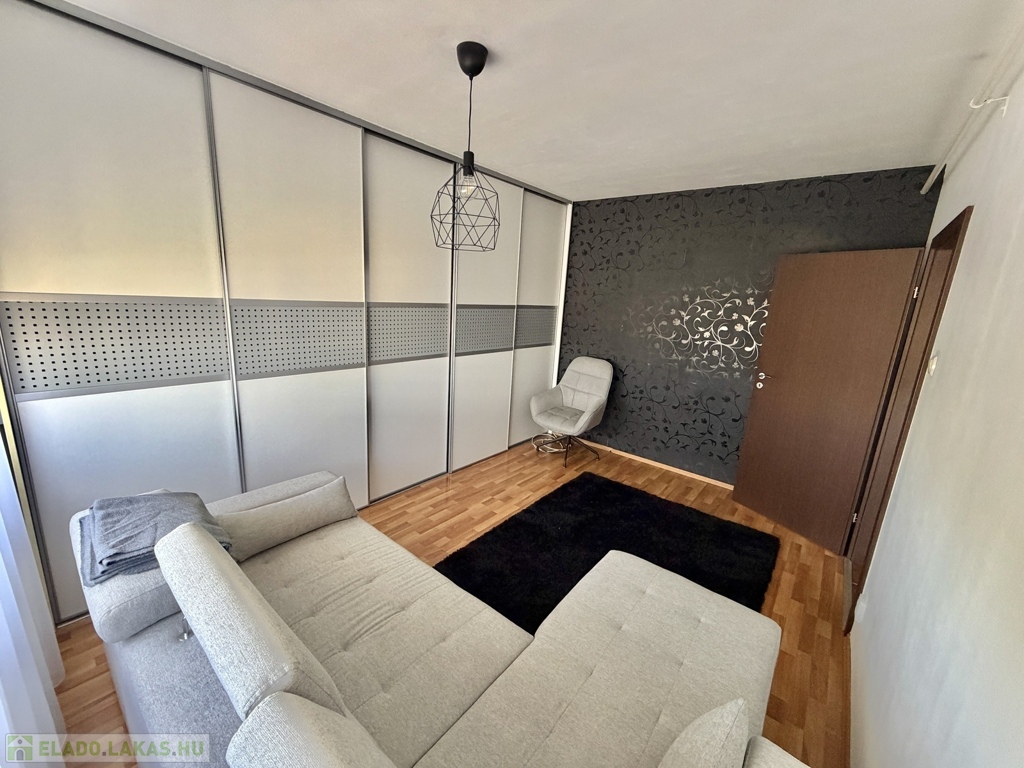 Panel építésű társasház 4. emeletén található, mért távfűtéses, klimatizált, redőnnyel szerelt műanyag nyílászárós, laminált padló, járólap burkolatú, közös tároló tartozik hozzá.