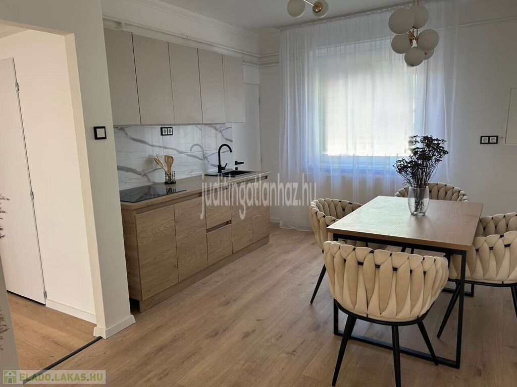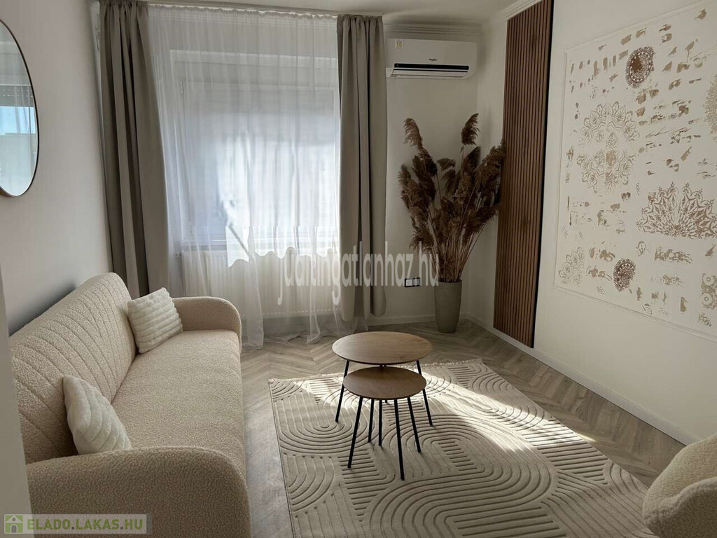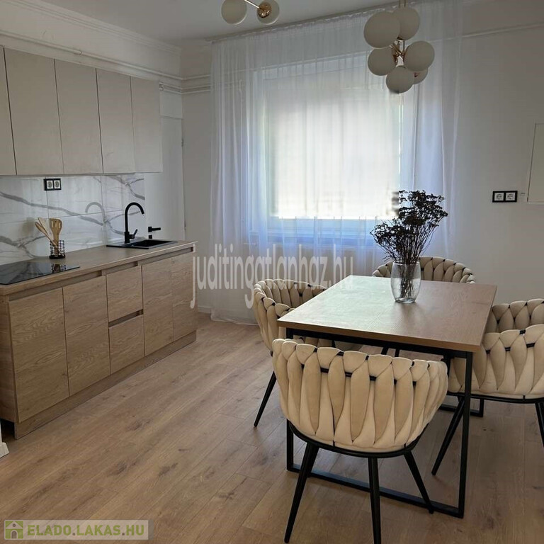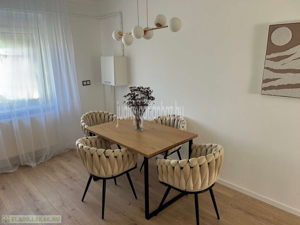 Nyíregyházán a Megyei kórház közelében eladó 59 m2-s, három különnyíló szobás, nagy konyha+étkező, külön fürdőszoba és wc, kamra, erkélyes, műanyag nyílászárós mely redőnnyel felszerelt, egyedi gáz és klíma fűtésű felújított lakás téglaépítésű szigetelt 6 lakásos zárt udvaros társas házban a második emeleten. Az ingatlan 2025-ben teljes felújításon esett át, vezeték és csövek cseréje megtörtént, új burkolat, minőségi falfestés. Az ingatlan ára a fotón látható teljes új bútorzattal együtt értendő, továbbá tartozik hozzá egy 13 m2-s udvari garázs az alagsorban saját tároló és saját udvari kert rész. Parkolni az utcán lehet díjtalanul. Az igényesen felújított és berendezett tehermentes ingatlanba költözni akár azonnal!