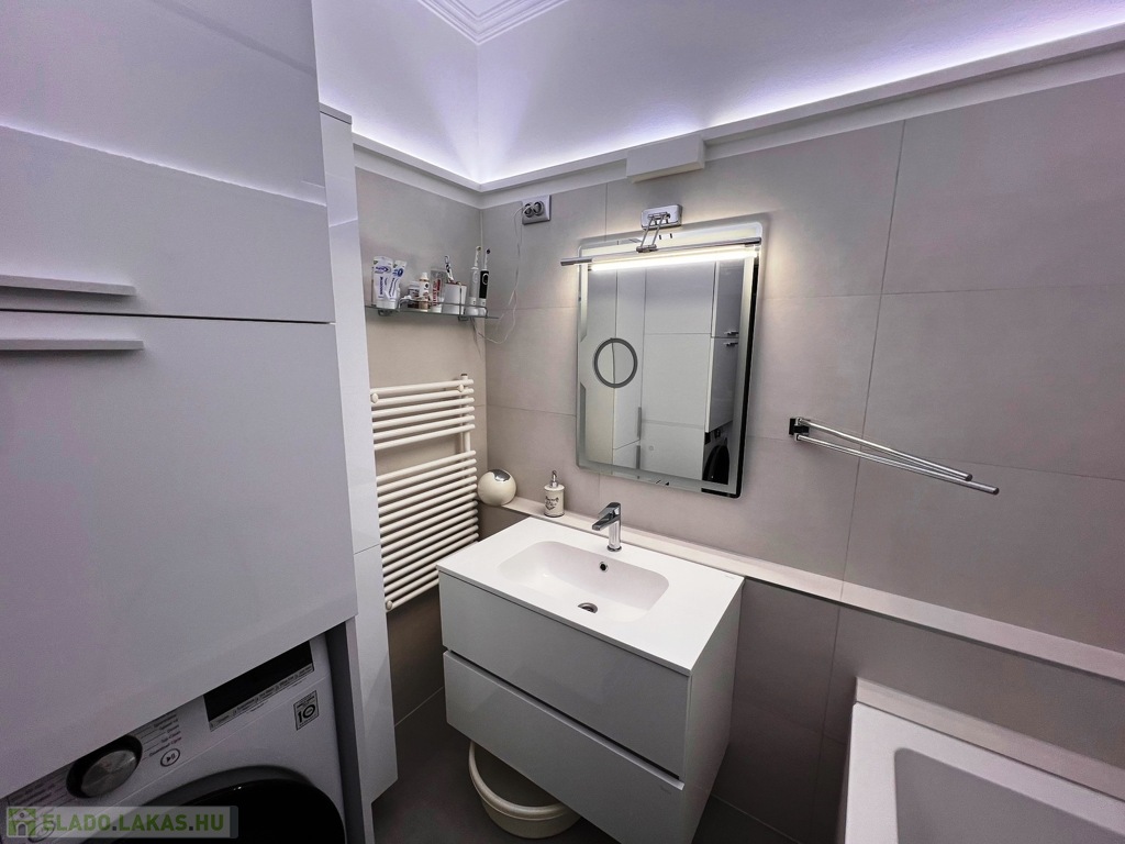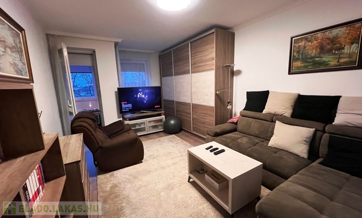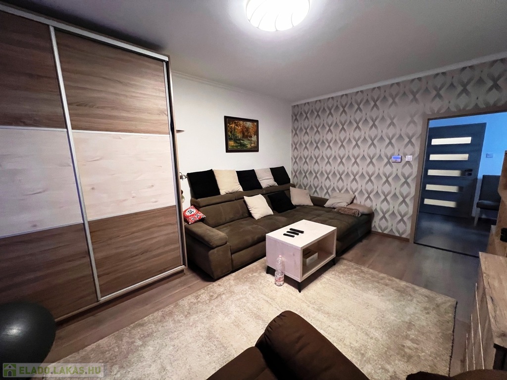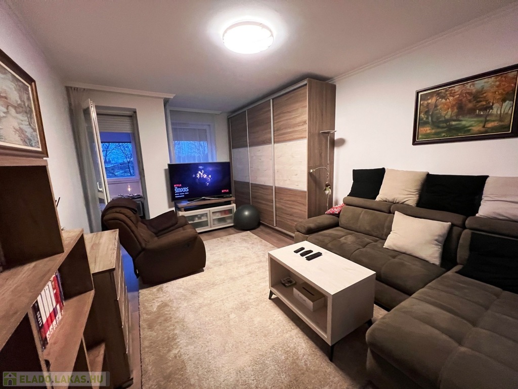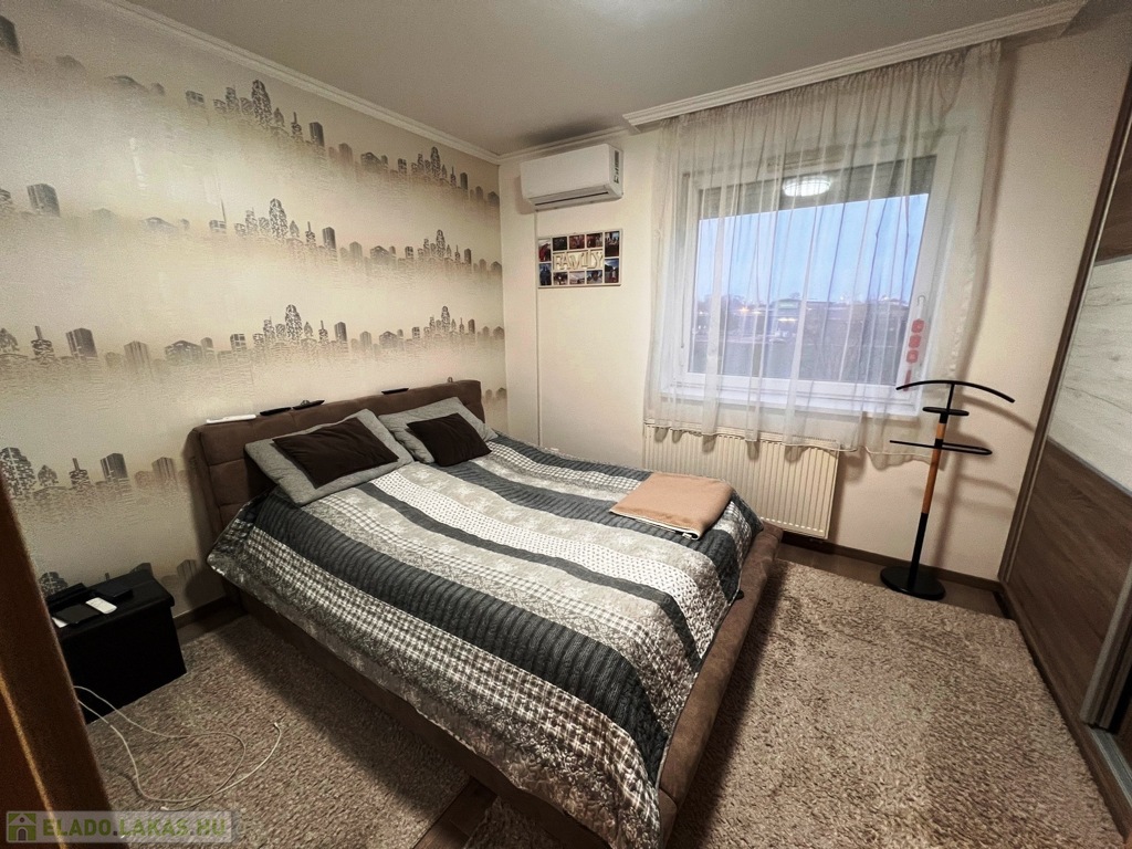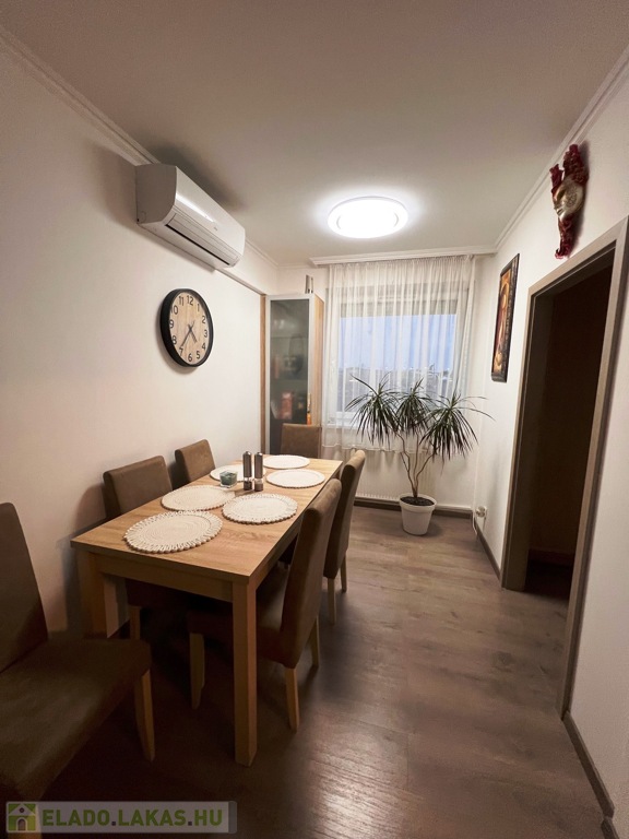 A lakás elrendezése praktikus és élhető: tágas nappali étkezőrésszel, külön nyíló két hálószoba, gardrób, konyha, fürdőszoba, külön helyiségben található WC, valamint egy zárt erkély biztosítja a kényelmet. Az otthon műanyag nyílászárókkal, redőnnyel, klímával és riasztóval felszerelt, a burkolatok igényesek, a szobákban laminált padló, a többi helyiségben járólap található. A házközponti fűtés egyedi mérővel szabályozható, így a fenntartási költségek tervezhetőek.