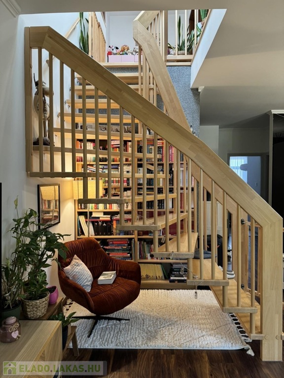 Az alsó szinten amerikai konyhás nappali található, egy külön nyíló szobával, tágas fürdőszobával, külön WC-vel, valamint egy praktikusan kialakított dolgozósarokkal. Az egyedi tervezésű, prémium minőségű belső lépcső nemcsak esztétikai elem, hanem a lakás karakterének egyik meghatározó része.