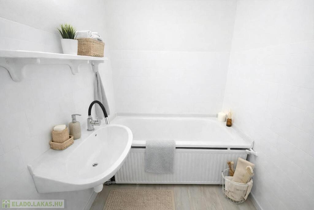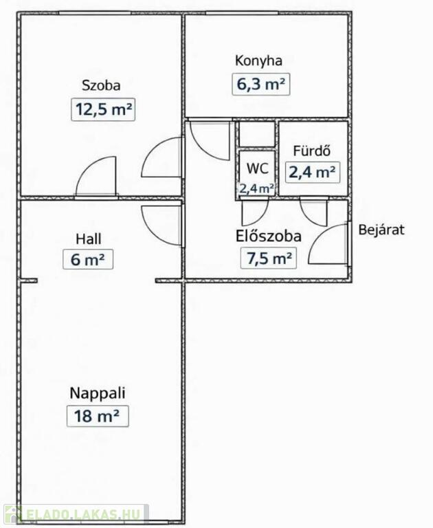 Elosztása praktikus és élhető: tágas nappali + hall (~24 m²) hálószoba (~12,5 m²) konyha (~ 6,3 m²) fürdő (~ 2,5 m²) WC (~ 1 m²) előszoba (~ 7,5 m²) Összesen: ~ 53 m²