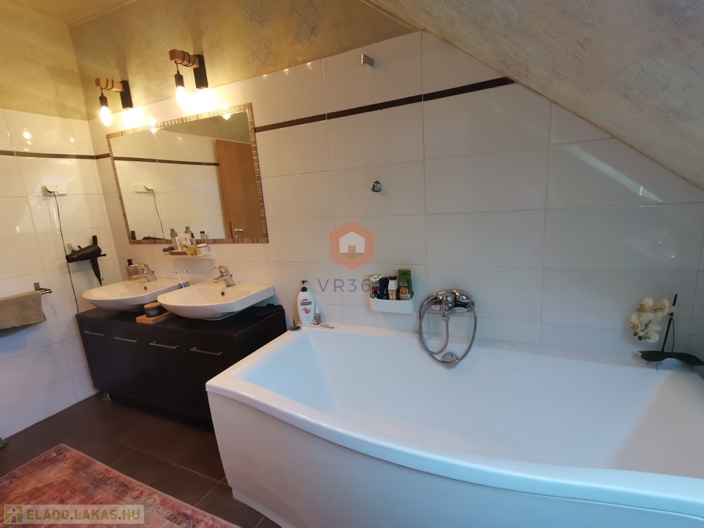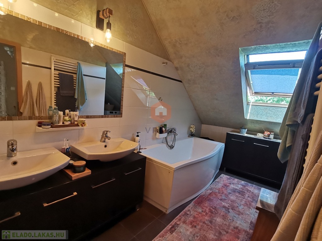 Egyedileg díszített emeleti fürdőszoba, káddal, WC-vel, az alsó szinten külön WC, tároló szoba a lépcső alatt.