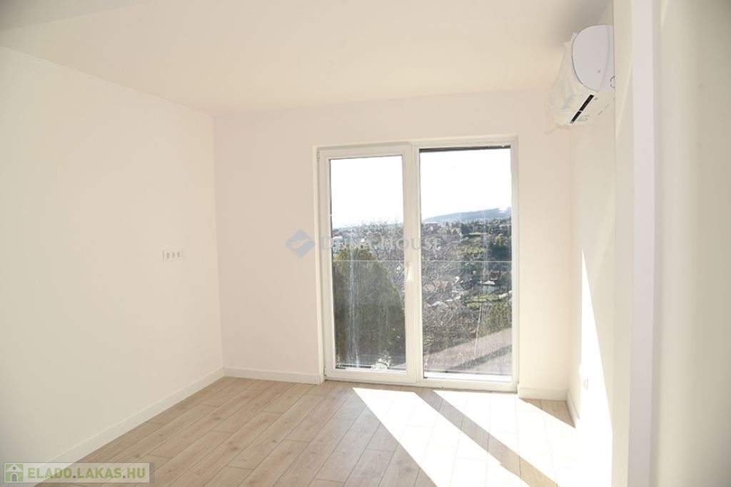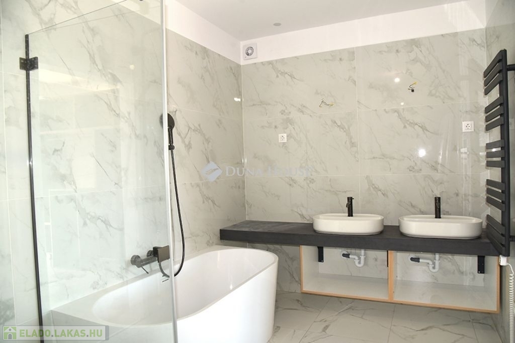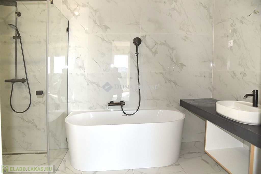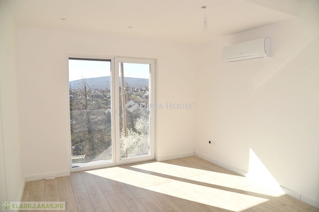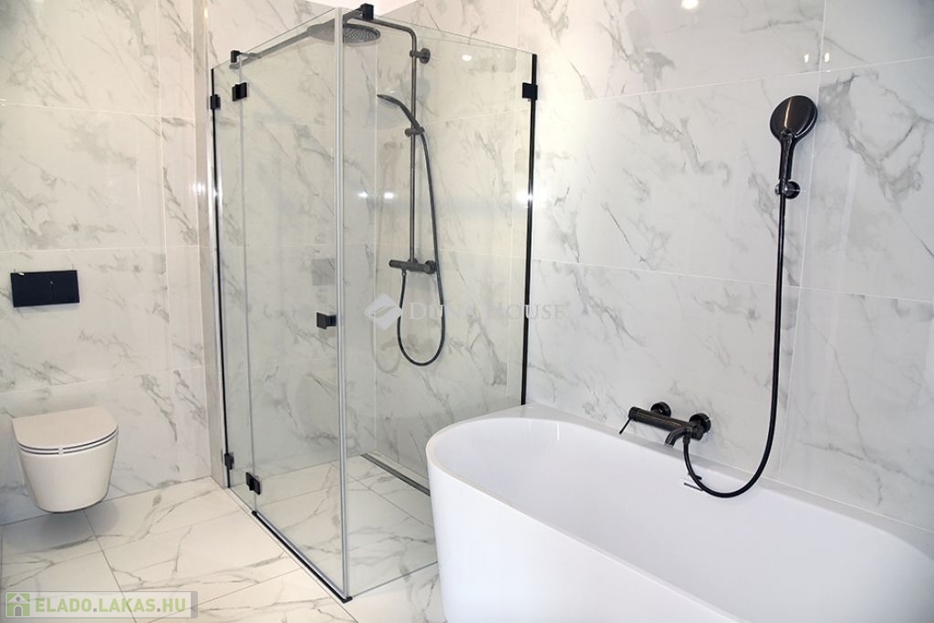 A hőszivattyús, padlófűtéses, elektromos zsalus, örök panorámás lakás prémium minőségű szaniterekkel, hideg - és melegburkolatokkal készült.