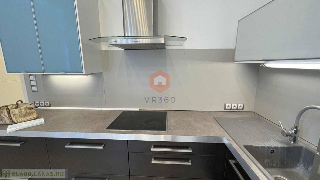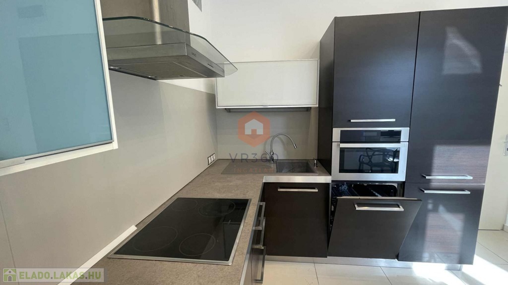 -beépített, gépesített konyha, elektromos főzőlappal és sütővel, mosogatógéppel, étkezővel,