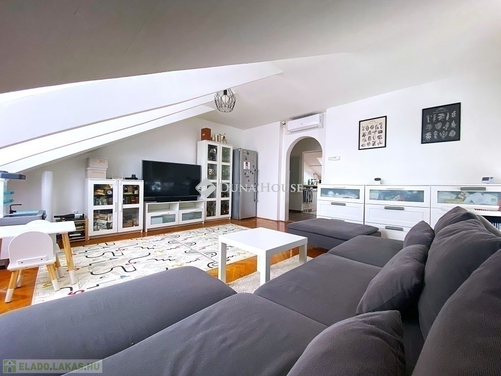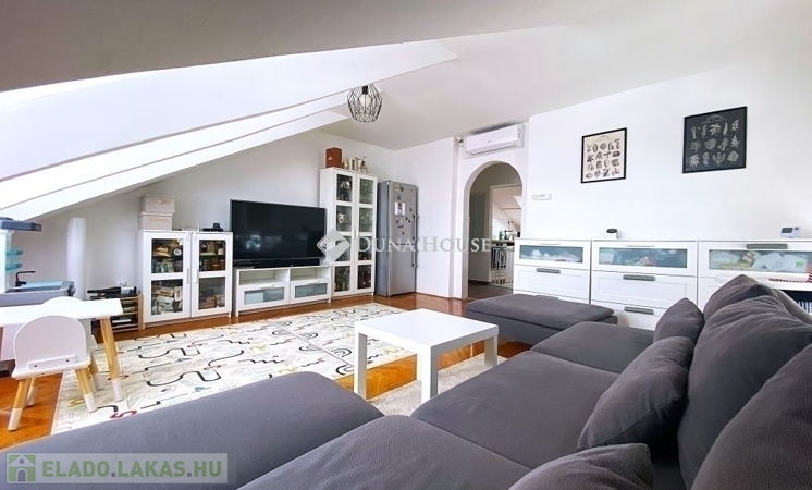 Pécsen, a közkedvelt Bánki Donát utcában eladó egy kiváló adottságokkal rendelkező tetőtéri téglalakás!A lakás bruttó 80 m²-es, nettó 50 m², míg a hasznos alapterülete 65 m², elosztása pedig rendkívül praktikus és élhető. A jól átgondolt alaprajznak köszönhetően 2 külön nyíló szoba és tágas nappali biztosítja a kényelmes életteret.A folyosóról nyílik egy kis háztartási helyiség, ahol a mosógép és szárítógép kényelmesen (hangszigetelten) elfér.Az ingatlan jó lokációban, gyerekbarát környezetben helyezkedik el, csendes, mégis jól megközelíthető környéken.Műszaki felszereltsége és állapota kiváló:- minőségi bejárati és beltéri ajtók- gáz-cirkó fűtés- a fürdőszobában padlófűtés- klimatizált, így nyáron is komfortosIdeális választás családoknak vagy befektetőknek egyaránt, akik egy jó elrendezésű, igényes otthont keresnek Pécs egyik kedvelt részén.