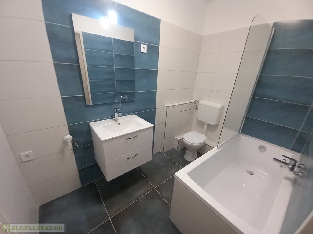 A modern fürdőszoba káddal felszerelt, amelyhez a praktikus használat érdekében zuhanyparaván is tartozik. A lakásban új, gépesített konyhabútor került beépítésre, amely tovább növeli az ingatlan komfortját és értékét.