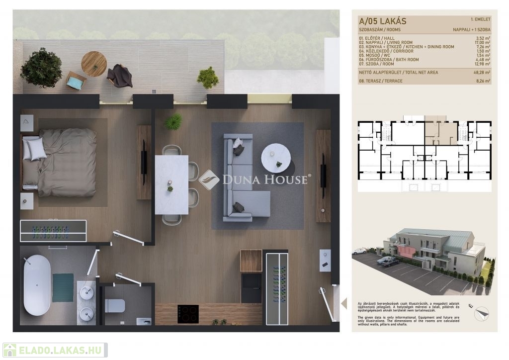 Az ingatlanban 48-119 nm közötti méretekben, a 1 szoba+nappalistól a 4 háló+nappalis elosztásig választhatunk, mindegyik lakáshoz saját tágas terasz is tartozik. A 2. emeleten 70 nm-es terasszal rendelkező PENTHOUSE LAKÁSOK kerülnek kialakításra, melyek igény szerint megoszthatók. A lakások minőségi burkolatai-szaniterei jelenleg egyedi igények szerint válaszhatók! Lehetőség van 22db teremgarázshely megvásárlására is nettó 8 M Ft/db áron!