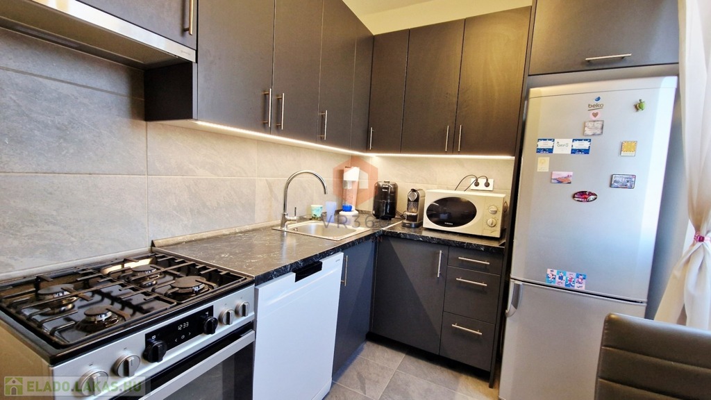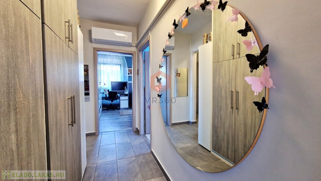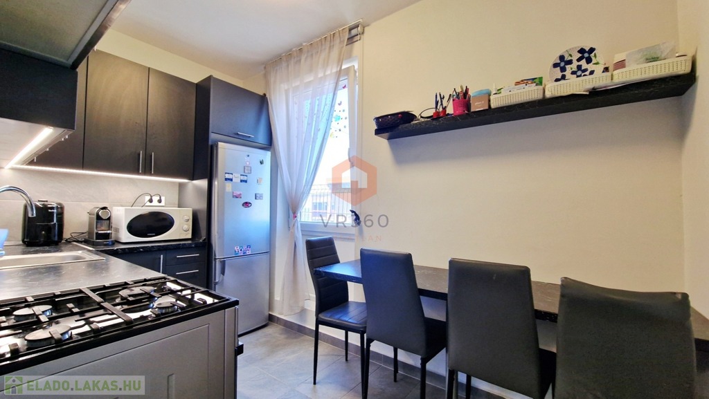 A lakás egyik nagy előnye a beépített, modern konyhabútor, melyhez sütő, főzőlap és mosogatógép is tartozik – mindez a vételár részét képezi. Az előszobában praktikus, egyedi gyártású beépített szekrények biztosítják a tárolási lehetőséget. A klimatizált nappali pedig a nyári időszakban is kellemes hőmérsékletet garantál. Az északi, keleti és nyugati tájolás révén a lakás egész nap természetes fényben fürdik, így mindig világos és barátságos a hangulata.