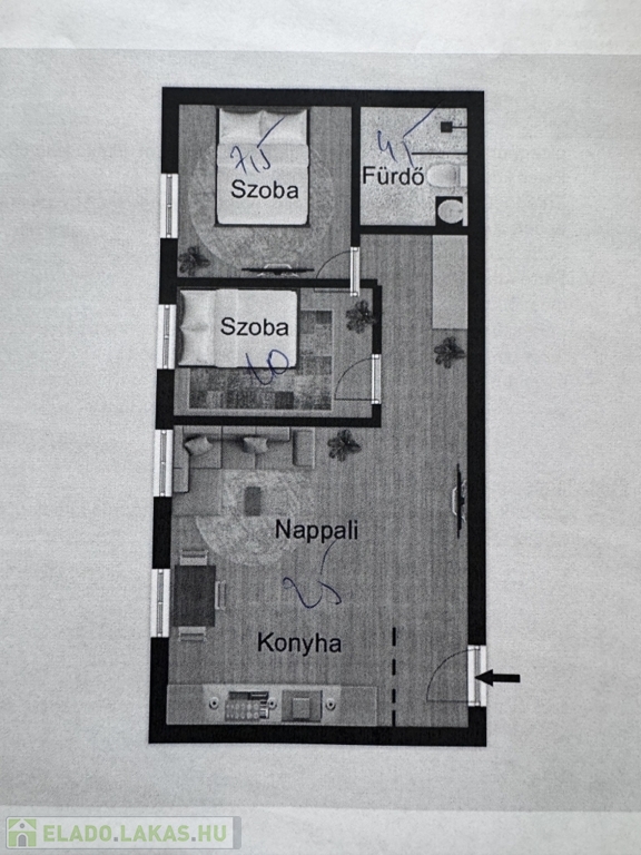 Helységek: nappali és két hálószoba. A lakás háromlakásos épületben található. A tető, a homlokzat és a belső terek is megújultak. Teljeskörű víz-, villany- és csatornahálózat-csere, új burkolatok és igényes kialakítás jellemzi.
