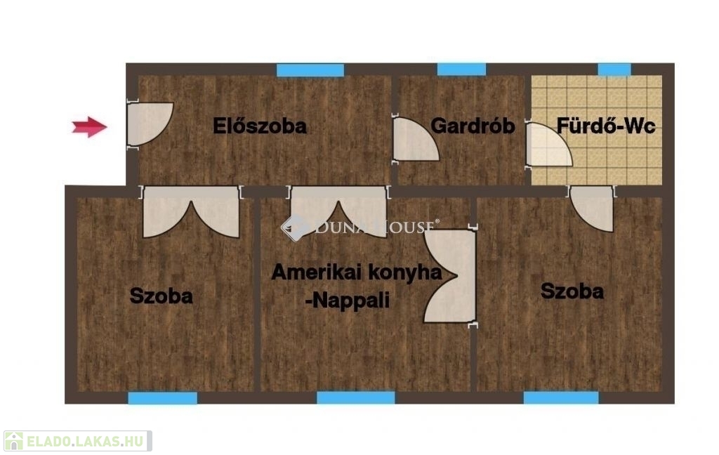 Az ingatlan elosztása: amerikai konyha-nappali+ 2 szoba, tágas előszoba, gardrób és fürdő-WC.