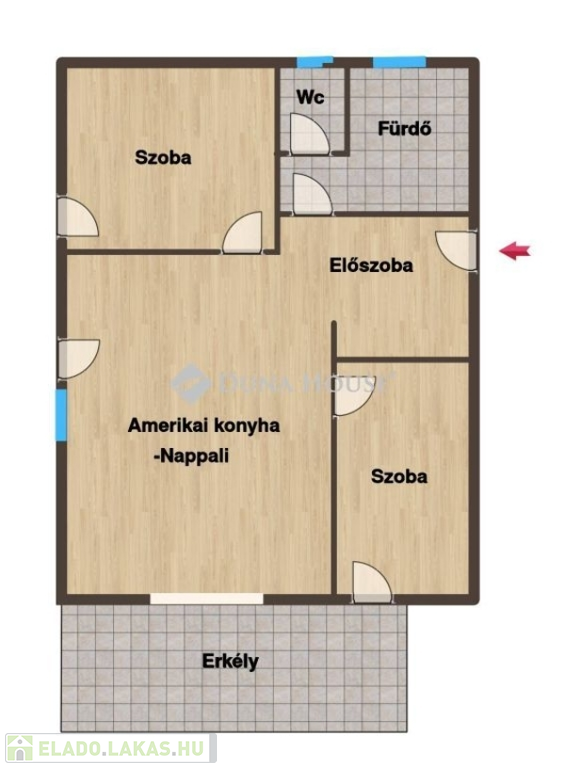 65 m2 alapterületű lakás /nappali-konyha-étkező, 2 hálószoba, fürdőszoba,