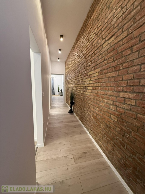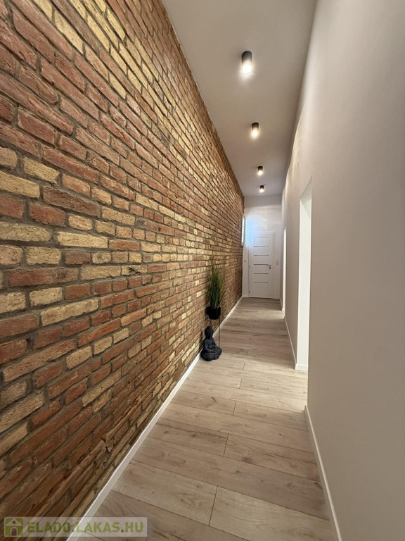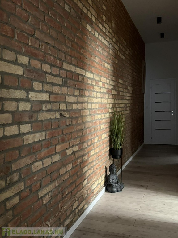 Különlegessége a folyosó teljes fala briliánsan kilátszó téglás, ami egyedi karaktert kölcsönöz a lakásnak.