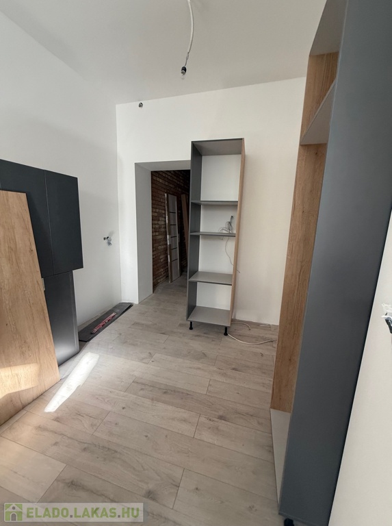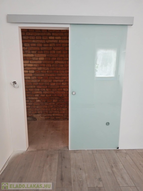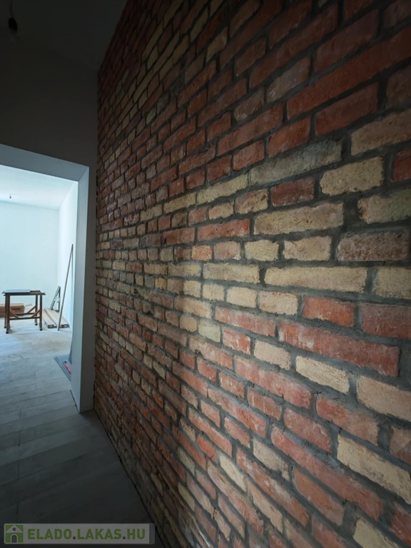 Különlegessége a folyosó teljes fala briliánsan kilátszó téglás, ami egyedi karaktert kölcsönöz a lakásnak.