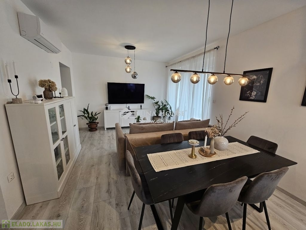 Eladó újszerű kertvárosi lakás, saját parkosított kertkapcsolattal!!!!!Pécs egyik csendes, zöldövezeti részén kínálunk megvételre egy 2023-ban átadott 92 m²-es földszinti lakást, amely minden igényt kielégítő belső kialakítással és kivételes külső adottságokkal rendelkezik.Kertkapcsolat és extra területekA lakáshoz tartozik egy 240 m²-es kizárólagos használatú, parkosított kert, benne egy könnyűszerkezetes, 10 m²-es kisházzal – ideális tárolónak vagy hobbihelyiségnek.Két kényelmes terasz, mindkettő beépített, kinyitható árnyékolóval.A kertből kiskapun keresztül is eljuthatunk a két autóbeállóhoz, melyek közvetlenül a lakás előtt helyezkednek el.Belső elrendezés 3 hálószoba Tágas nappali-konyha-étkező egy légtérben 2 igényes fürdőszobaPrémium felszereltség FAP olasz hidegburkolatok Hansgrohe falba süllyesztett csaptelepek Blanco gránit mosogató és csaptelep a konyhában Minőségi német konyhabútor kompakt munkapulttal, konyhaszigettel Új, elektromos fehér alumínium redőnyök minden ablakon Hőszivattyús padlófűtés + fancoil hűtés a kellemes klímáért egész évben Alacsony rezsiköltségek, energiahatékony, és letisztult, igényes belső terek.Elhelyezkedés szempontjából is ideális:A belváros autóval mindössze 7 perc, de a tömegközlekedés is kiváló. A mindennapi ügyintézéshez szükséges szolgáltatások csupán egy percre találhatók: Tesco, Rossmann, gyógyszertár, minden gyalogosan is gyorsan elérhető.