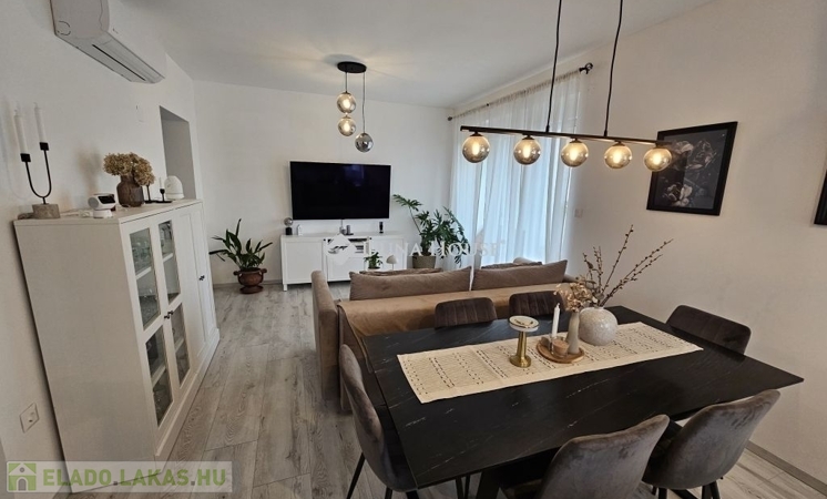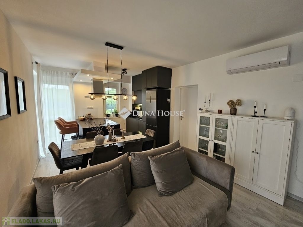Kertkapcsolat és extra területek. A lakáshoz tartozik egy 240 m²-es kizárólagos használatú, parkosított kert, benne egy könnyűszerkezetes, 10 m²-es kisházzal ideális tárolónak vagy hobbihelyiségnek. Két kényelmes terasz, mindkettő beépített, kinyitható árnyékolóval. A kertből kiskapun keresztül is eljuthatunk a két autóbeállóhoz, melyek közvetlenül a lakás előtt helyezkednek el. Belső elrendezés 3 hálószoba Tágas nappali-konyha-étkező egy légtérben 2 igényes fürdőszobaPrémium felszereltség FAP olasz hidegburkolatok Hansgrohe falba süllyesztett csaptelepek Blanco gránit mosogató és csaptelep a konyhában Minőségi német konyhabútor kompakt munkapulttal, konyhaszigettel Új, elektromos fehér alumínium redőnyök minden ablakon Hőszivattyús padlófűtés + fancoil hűtés a kellemes klímáért egész évben Alacsony rezsiköltségek, energiahatékony, és letisztult, igényes belső terek.