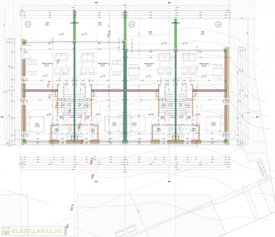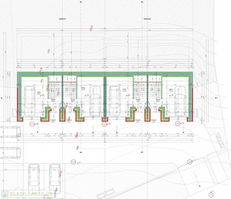 Összesen 4db duplakomfortos lakás kap helyet, konyha-nappali+3 hálóval, mindegyik garázzsal, kertkapcsolattal, alsó és felső szintel.