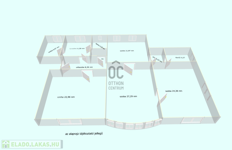 Helyiségek: 4 egész szoba, 1 félszoba, előszoba, konyha, fürdőszoba+wc, külön wc, kamra