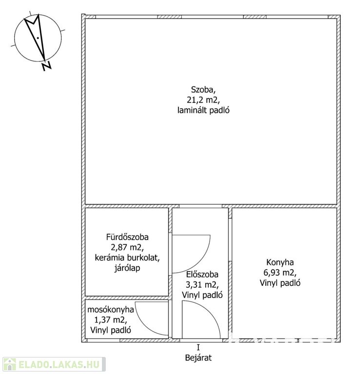A szoba padlóburkolata laminált padló, a konyha, a mosókonyha és a bejárat vinyl burkolatot kapott, a fürdőszoba csúszásmentes, a falburkolattal azonos színű, járólapos burkolású.
