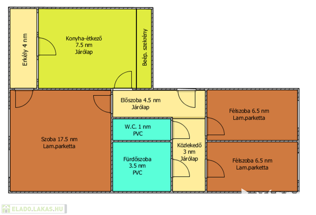 Helyiségei: 1 szoba, 2 félszoba, konyha, előszoba, közlekedő, fürdőszoba, külön nyíló W.C., erkély.