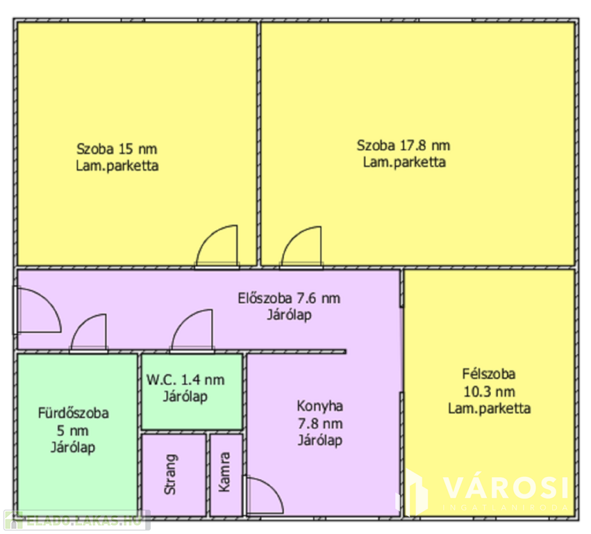 Az ingatlanban 2 szoba, 1 félszoba, fürdőszoba, külön nyíló W.C., konyha, kamra, előszoba található.