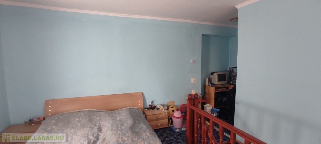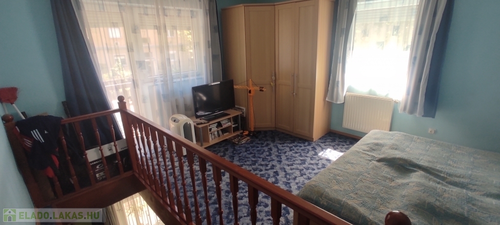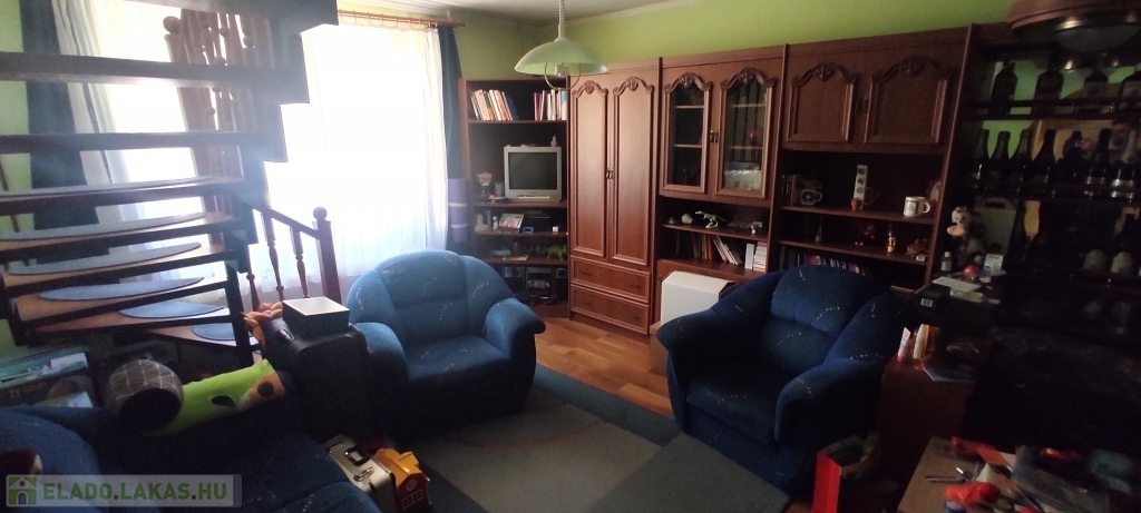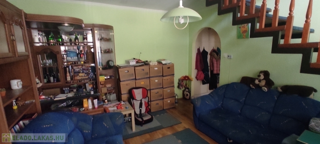 A lakás bejárata a magasföldszinten van, a felső szintre az alsó nappaliból nyíló lépcsőn lehet felmenni.