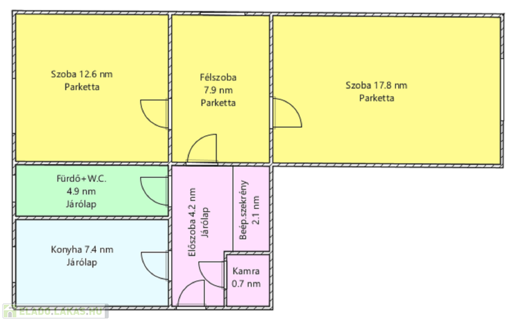 Helyiségei: 2 szoba, 1 félszoba, étkező, konyha, kamra, előszoba, fürdőszoba.