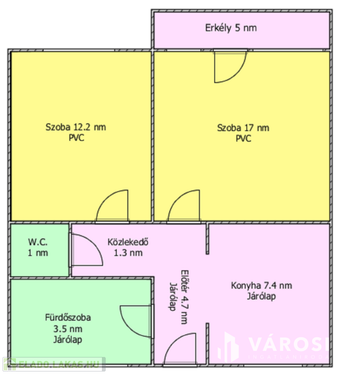 Helyiségei: 2 szoba, konyha, előszoba, közlekedő, fürdőszoba, külön nyíló W.C., erkély.