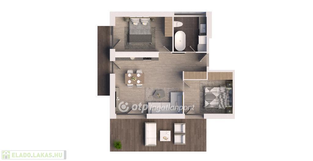 Helyiségek: nappali + 2 hálószoba, fürdőszoba, konyha-és étkező.