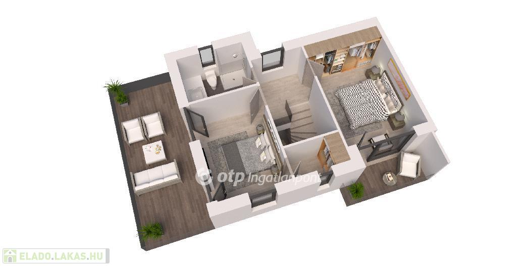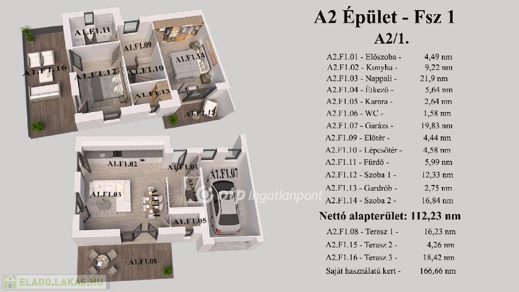 A földszinten található a tágas nappali, a garázs és egy 16,23 nm terasz, amely közvetlen kertkapcsolattal rendelkezik. Az emeleten kapott helyet a két hálószoba, két fürdőszoba és két különálló terasz(4,26 és 18,42 nm), amelyek biztosítják a kellemes pihenést.
