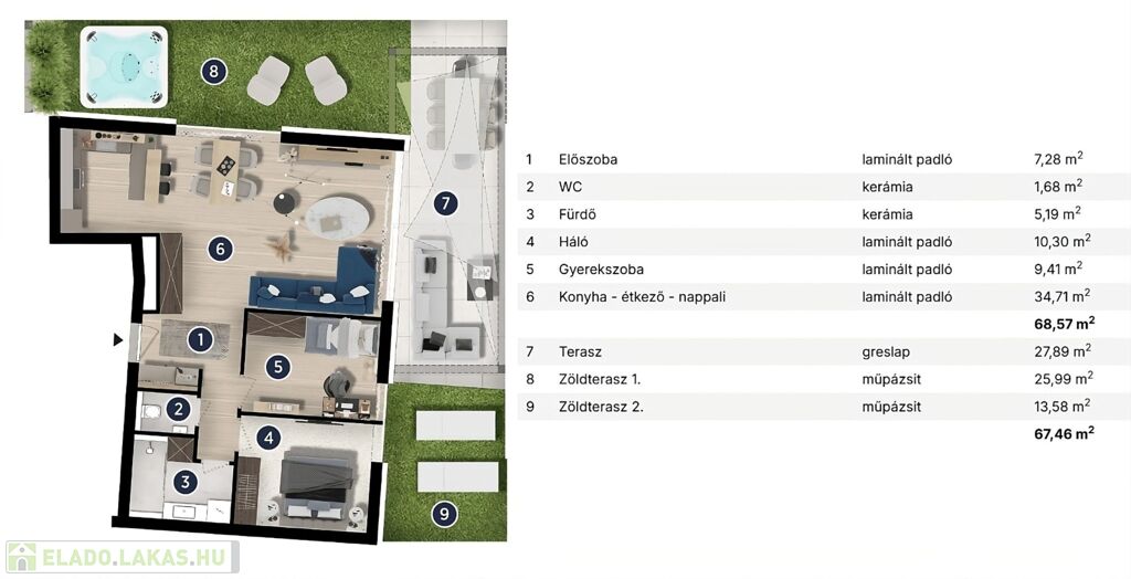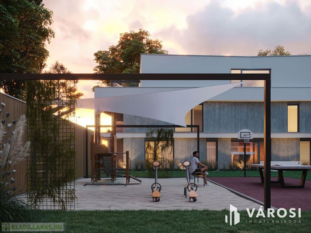- Földszinti lakások: fedett terasszal és saját, kertkapcsolatos udvarrésszel, élősövénnyel leválasztva