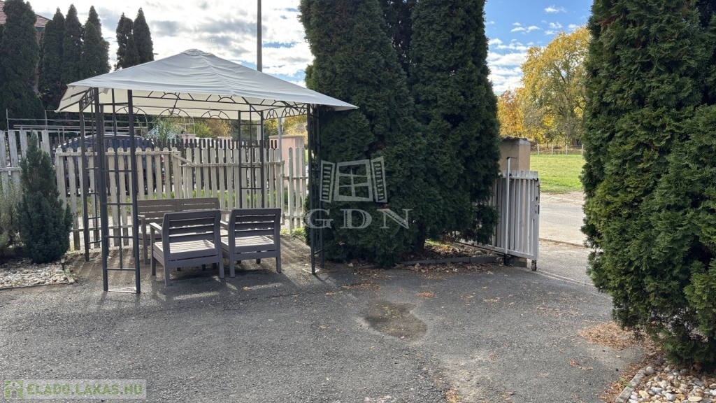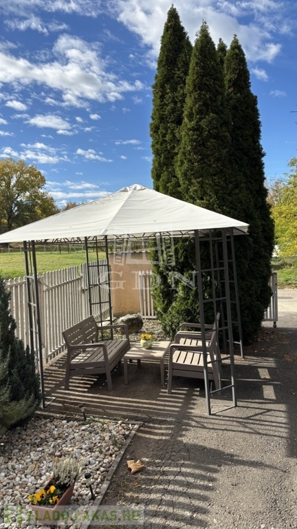 Udvari tároló, szaletli, kertben mosott kavics és virágok