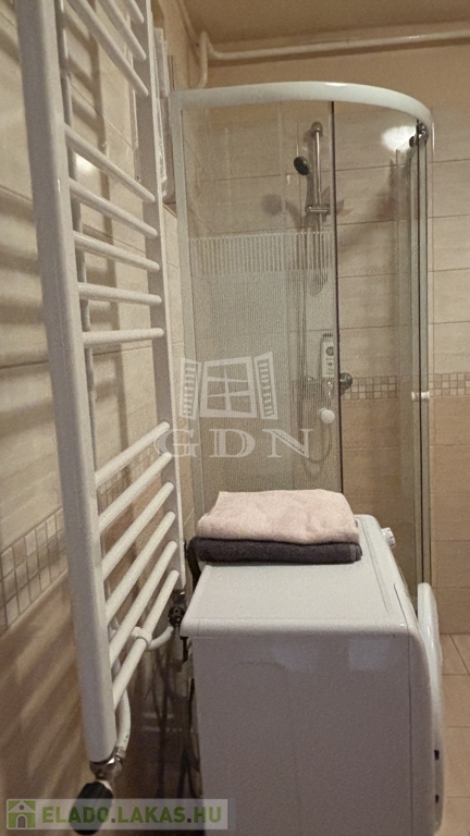 Fürdőszoba, tusolóval, wc, mosdó, törölköző szárító