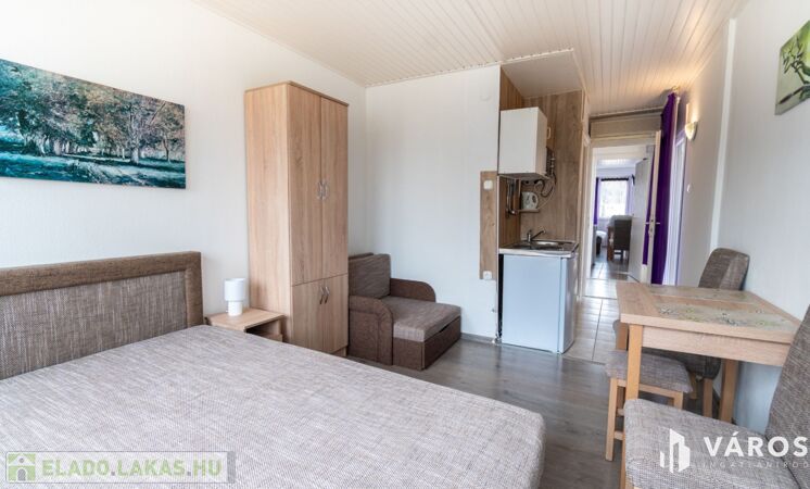 Eladó Siófok Aranyparti részén épült társas üdülő első emeletén lévő balatoni panorámával rendelkező gyönyörű nyaraló. A lakás mindössze 150 méterre található a híres siófoki Aranyparttól. A partszakasz ezen része ingyenes, így korlátlanul élvezheti a Balaton nyújtotta lehetőségeket. Busz- és vasúti megálló, boltok, éttermek pár perc sétára találhatóak. Az ingatlan 2021-ben nagy felújításon esett át, melynek keretében új laminált parketta lett lerakva, valamint a teljes berendezés A-tól Z-ig kicserélésre került.