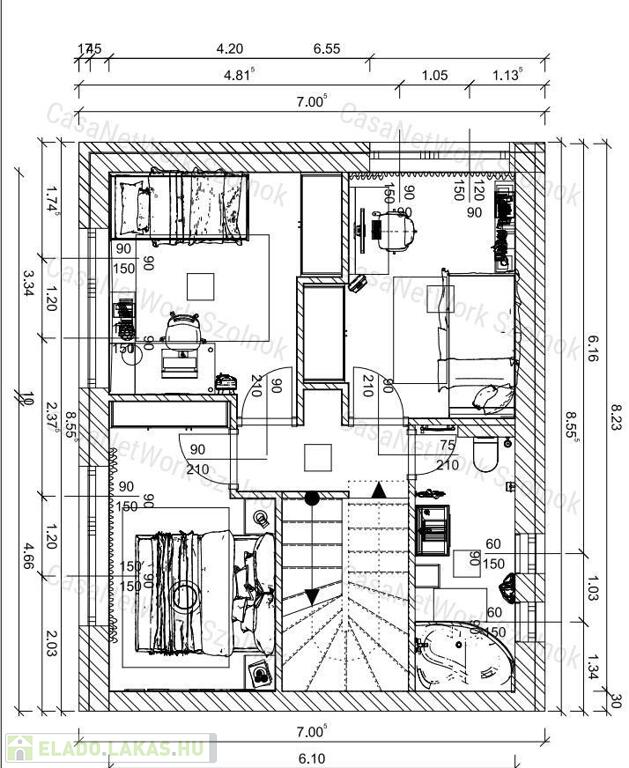 - elosztását tekintve előtér, nappali, konyha-étkező, 3 szoba, 2 db fürdőszoba + wc, közlekedő, terasz