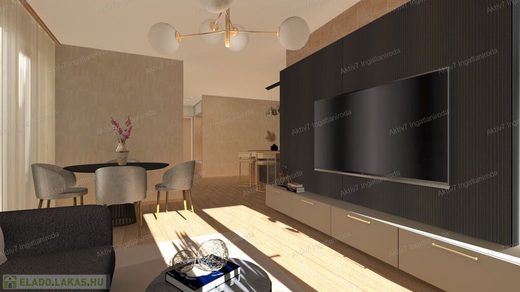 A szóban forgó lakás negyedik emeleti, 63,48 m2 területű, amerikai konyha nappali +2 hálószobás, a hozzá tartozó 7,64 és 6,23 m2 erkélyekkel (a fotók között található alaprajz szerint).
