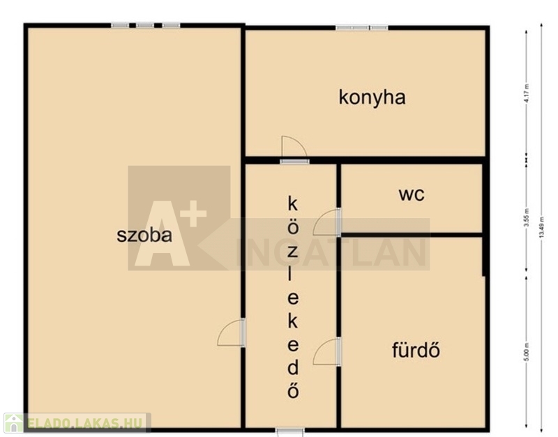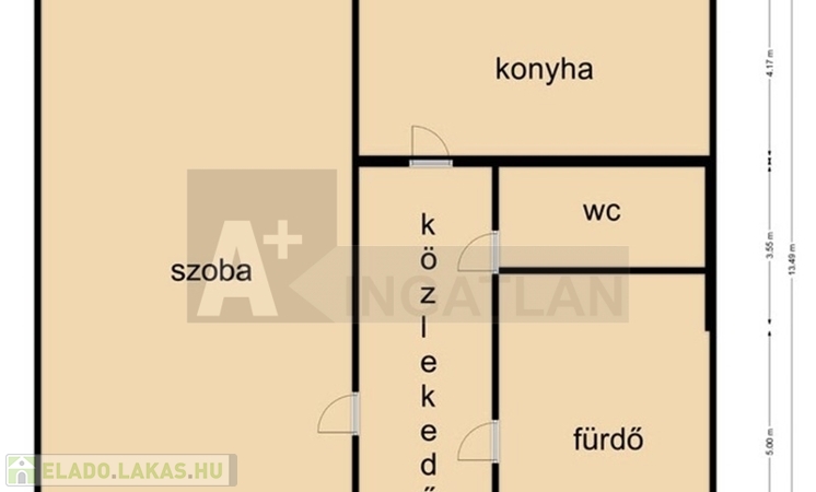 A lakás elrendezése :egy nagy szoba ,kényelmes méretű konyha ,külön fürdőszoba ,wc.